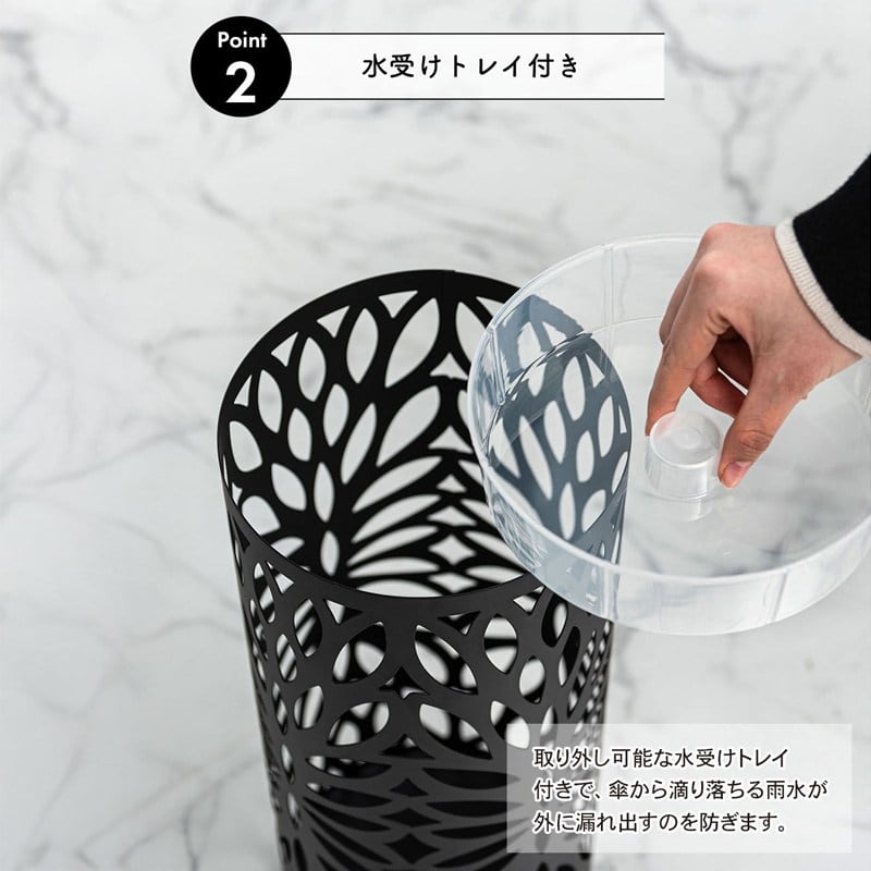 ●取り外し可能な水受けトレイ付きで、傘から滴り落ちる雨水が外に漏れだすのを防止。