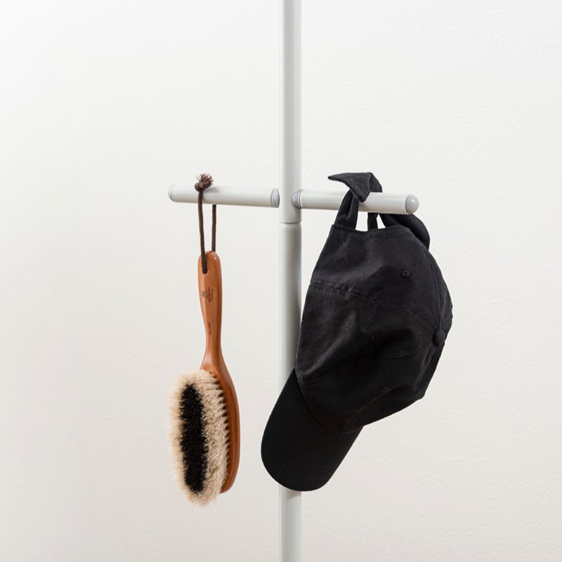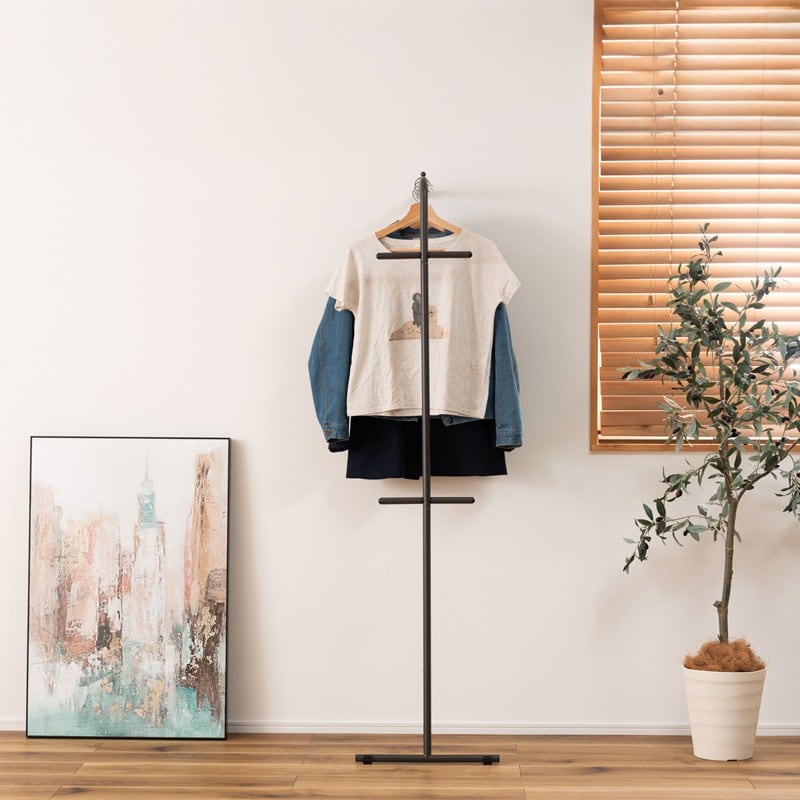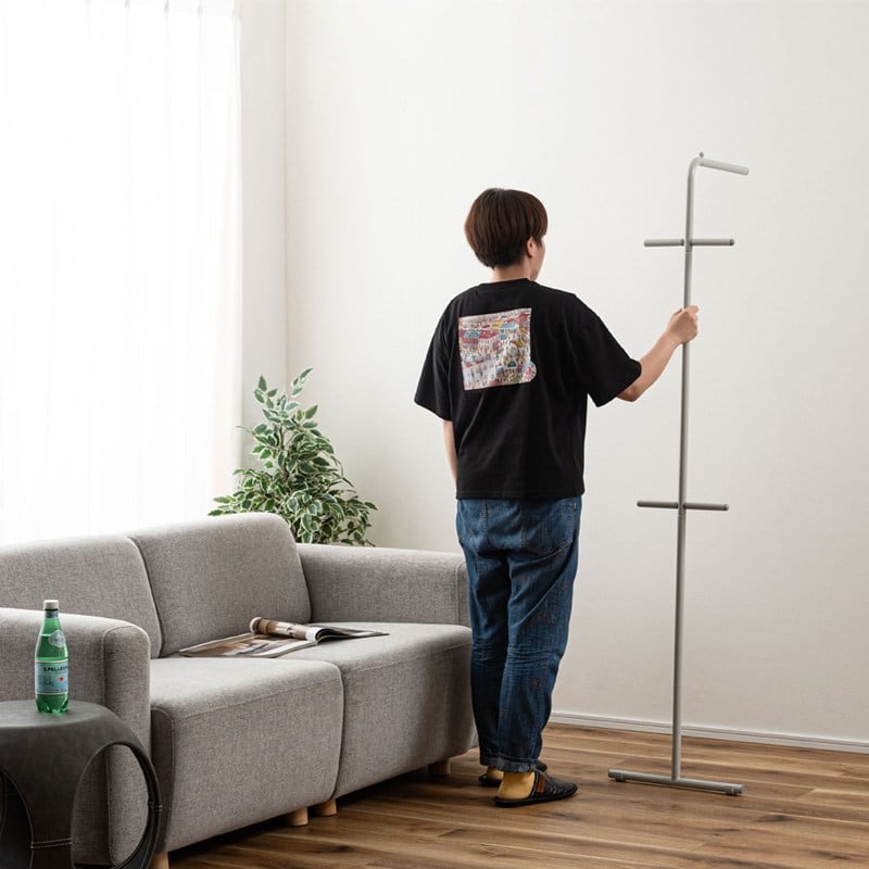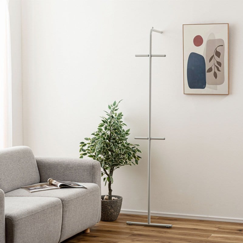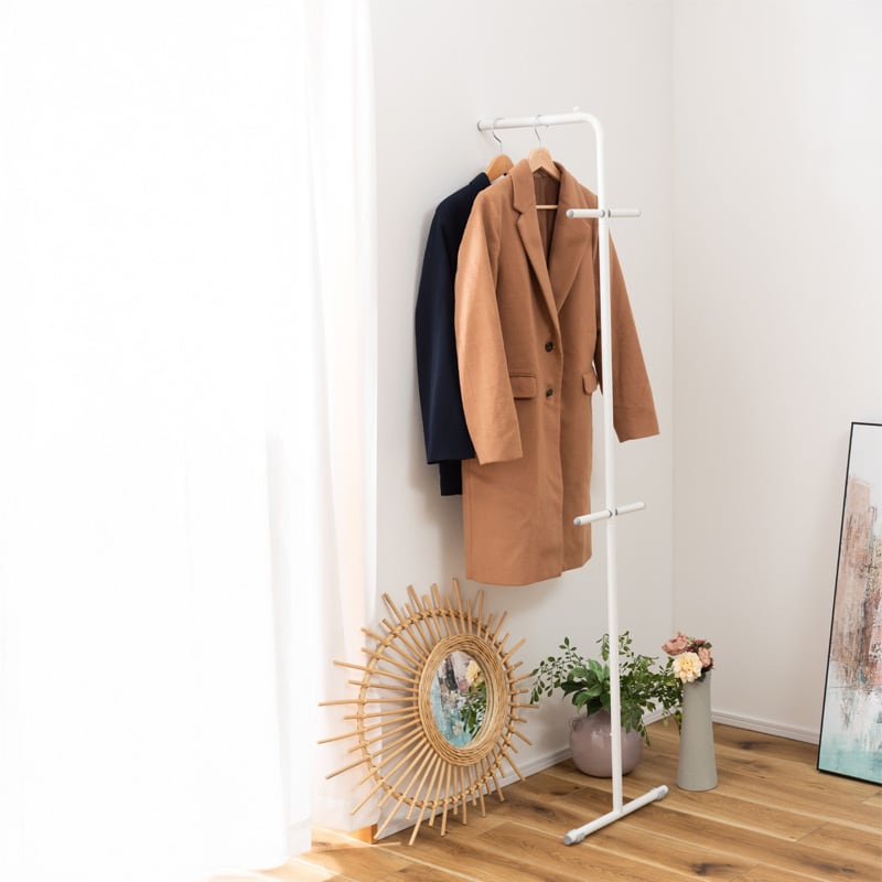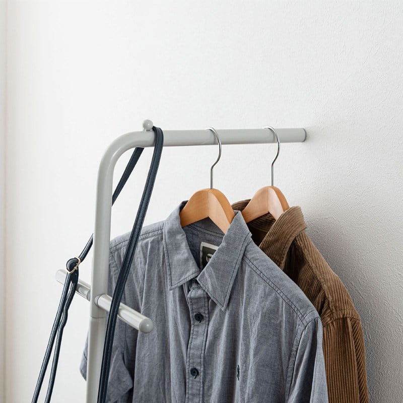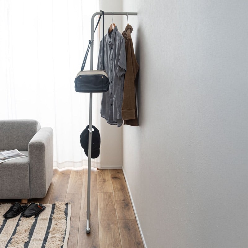 お部屋の中や玄関などの好きな所に立てかけるだけなので場所を取らず、洋服やコート、鞄などを簡単に収納することができます。