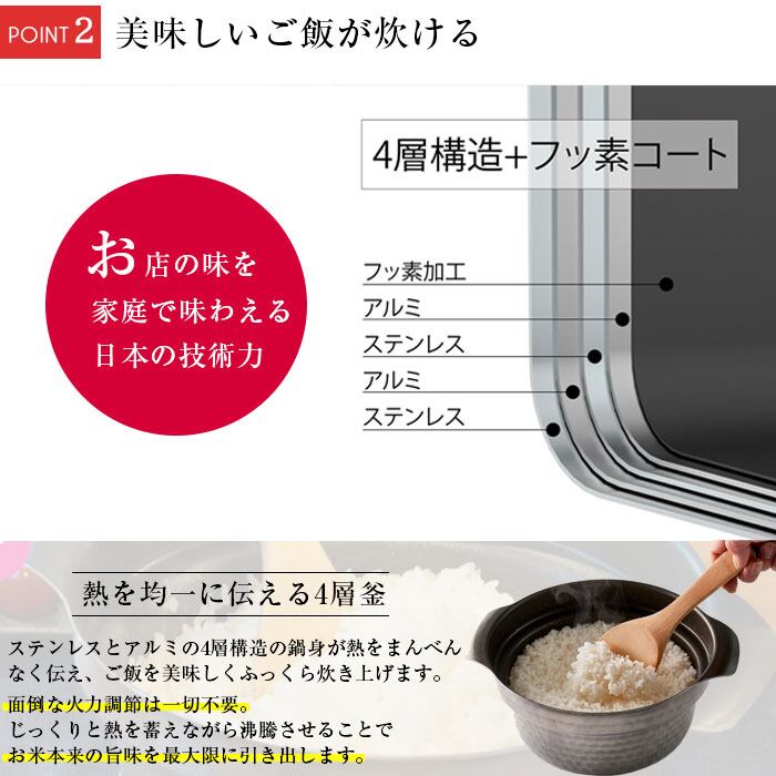 ステンレスとアルミの4層構造の鍋身は熱をまんべんなく伝え、ご飯を美味しく炊き上げます。