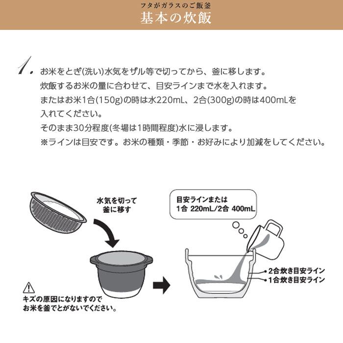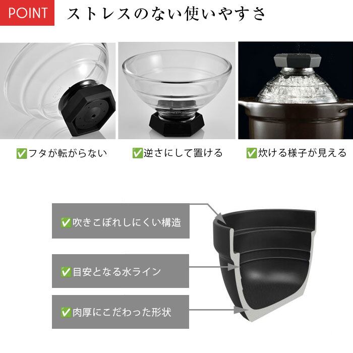 透明な耐熱ガラスフタなので、ご飯が炊ける様子が見えます。