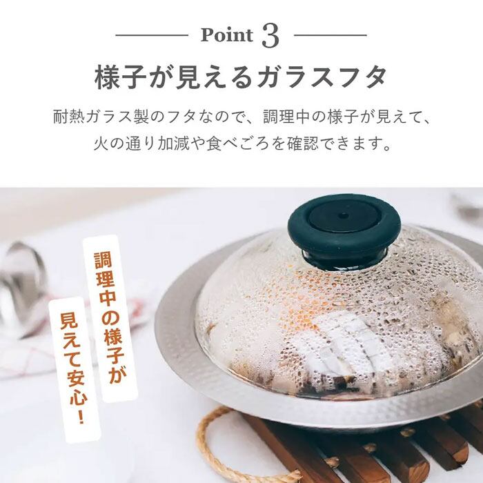 耐熱ガラス製のフタなので調理中の中の様子が見えて食べごろが分かります。
